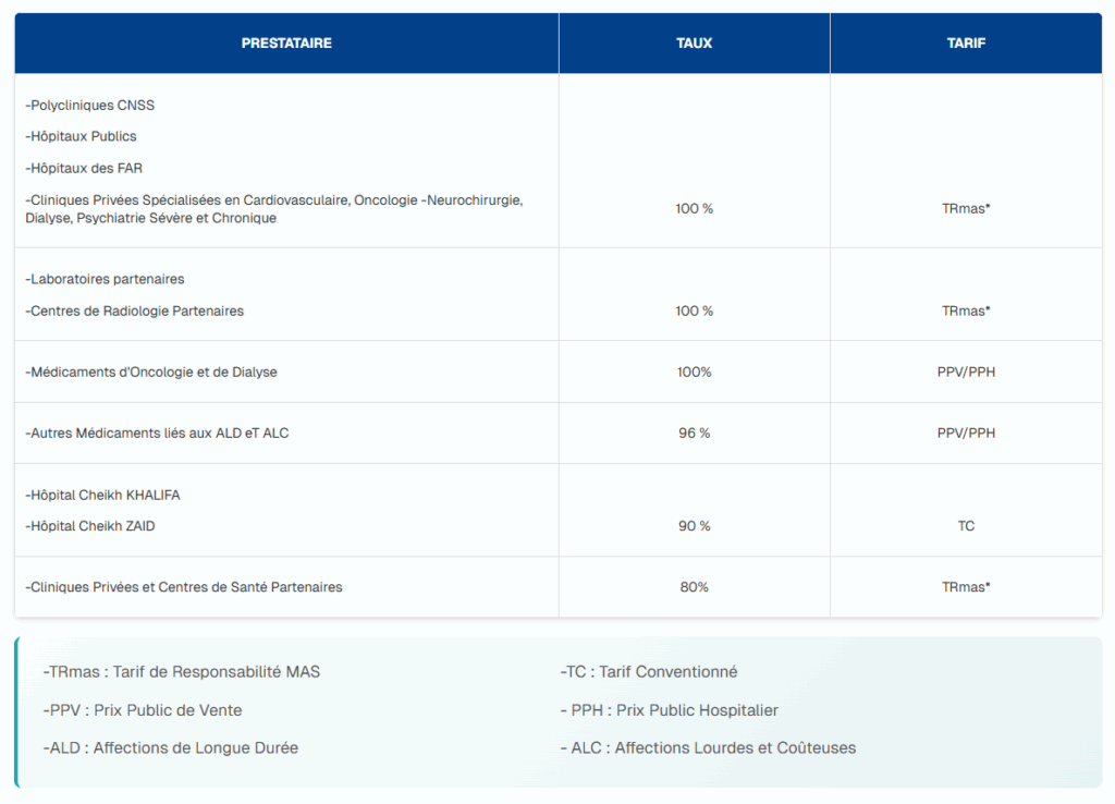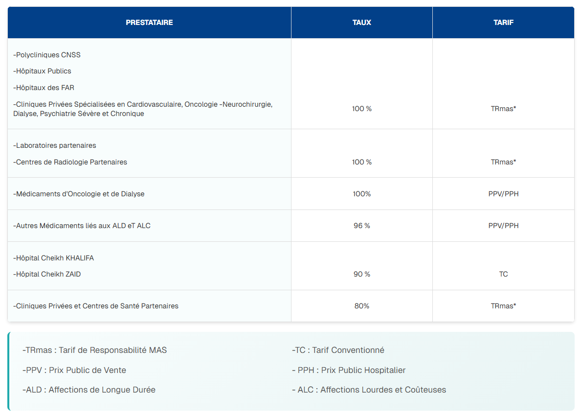 La MAS prend en charge via son système Tiers Payant, les prestations réalisées avec les producteurs de soins et les fournisseurs notamment, selon la tarification adoptée par ses instances de gouvernance :