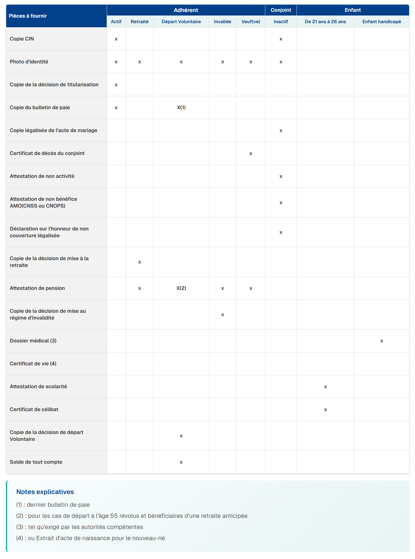 • Les épouses à charge (en cas de polygamie) en inactivité;